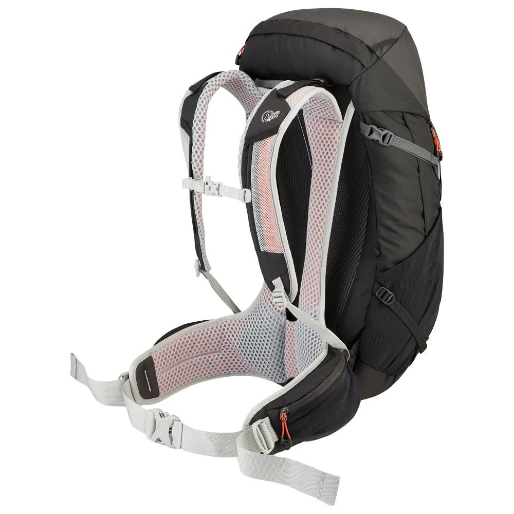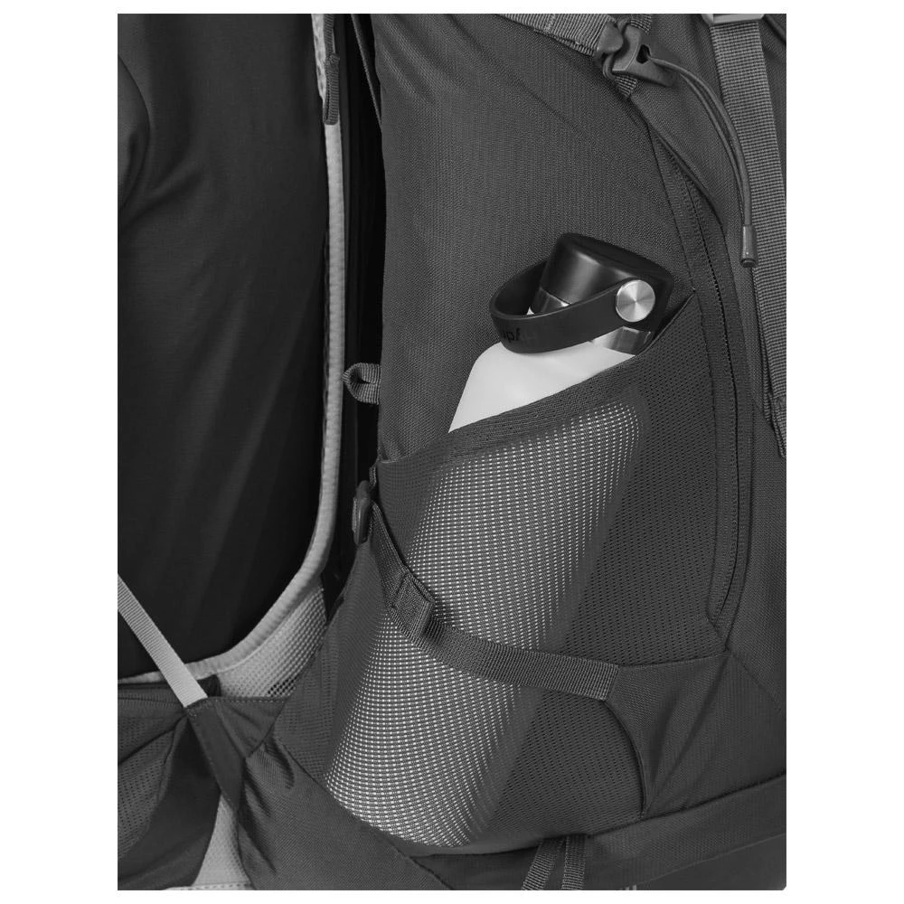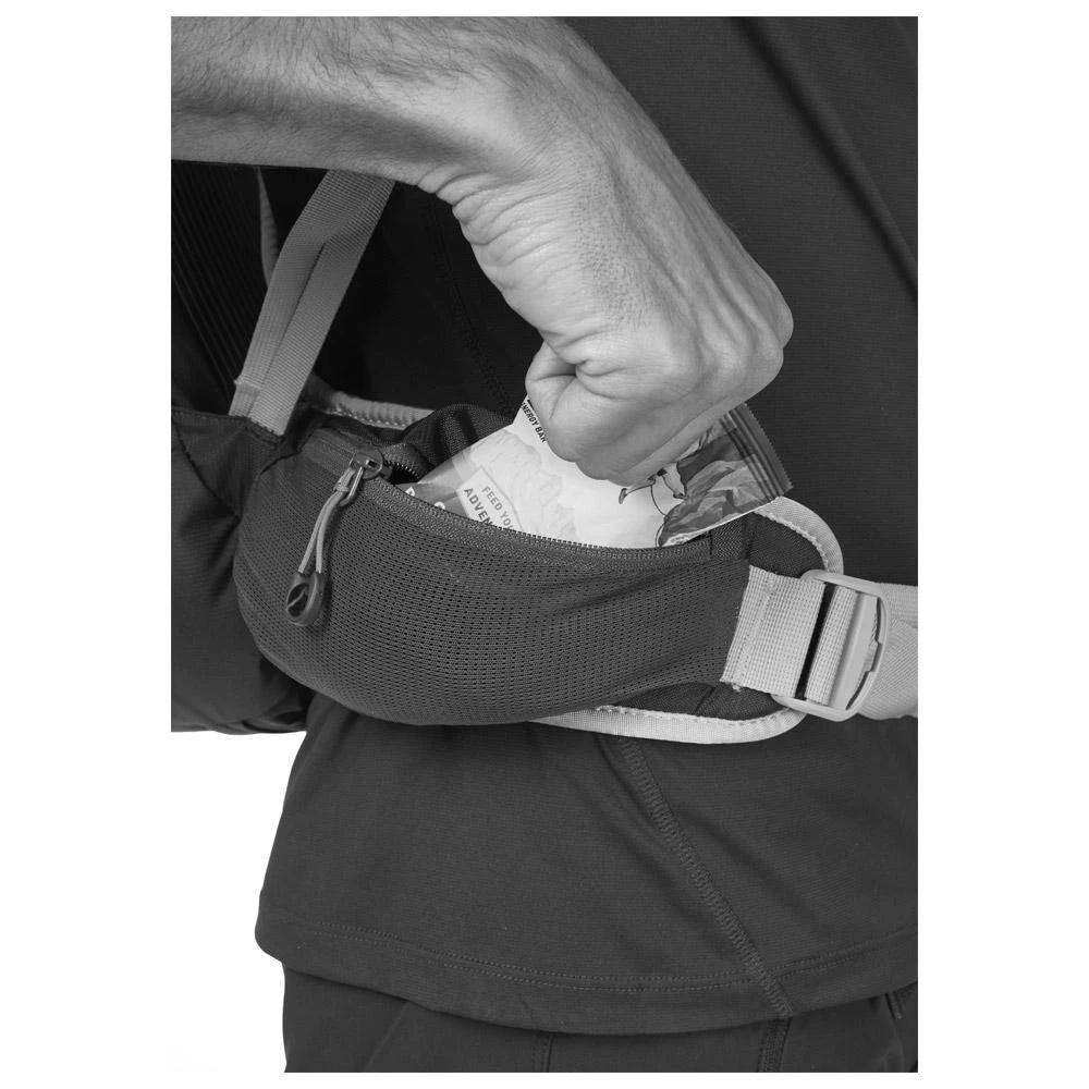 Die Öffnung von oben bietet Zugang zum Hauptfach, das mit einer Klappe abgedeckt ist, die mit einem Riemen geschlossen wird, der über oder unter der erweiterbaren Fronttasche verläuft. Im Inneren kann eine Wassertasche vom Typ Camelbak angebracht werden. An der Außenseite befinden sich Halterungen für Wanderstöcke und ein Eispickelhalter. Die Seitentaschen können für Trinkflaschen oder kleine Wasserflaschen verwendet werden.