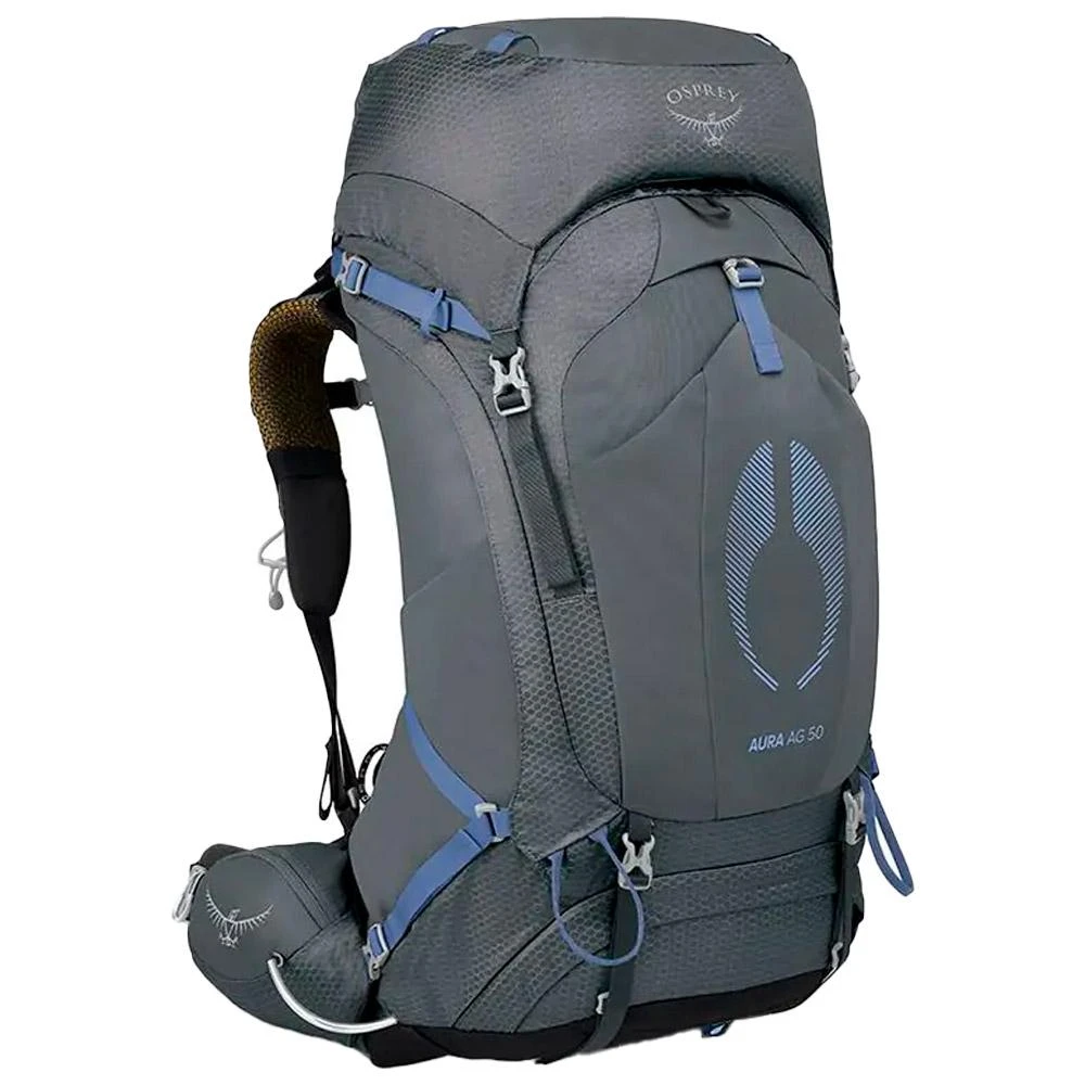 Der Damen-Rucksack Osprey Aura Ag 50 ist überaus praktisch für lange Wanderungen über mehrere Tage. Sein Volumen von 50 Litern (in Größe M und L) bietet genug Platz, um Kochgeschirr, Wechselkleidung, Erste-Hilfe-Set uvm. unterzubekommen. Eine Trennwand im Hauptfach sorgt dafür, dass ihr euren Schlafsack sicher verstauen könnt. Ein Gurt außen ist für die Isomatte bestimmt. Dazu findet ihr Halterungen für Eispickel und für Wanderstöcke vor. Letztere könnt ihr sogar abnehmen, ohne dafür den Rucksack absetzen zu müssen. Eine Tasche ist für ein Trinksystem Hydraulics oder Hydraulics LT vorgesehen. Das Rückenpolster AirScape lässt die Luft zirkulieren. Die Schulterträger lassen sich individuell anpassen und sorgen zusammen mit dem Bauchgurt für eine optimale Lastenverteilung und damit einen langanhaltenden Tragekomfort. Eine wasserabweisende Beschichtung schützt eure Sachen vor Feuchtigkeit und ihr könnt eine wasserdichte Regenhaube über den Rucksack ziehen, falls es anfängt zu regnen.
