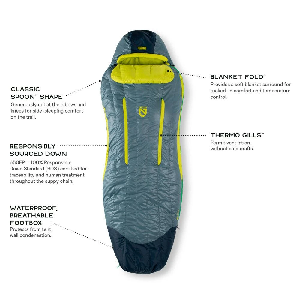 Der Disco 30 ist ein Nemo-Schlafsack mit einer Daunenfüllung, die nach dem Responsible Down Standard zertifiziert ist und über eine wasserabweisende Behandlung ohne Perfluorkohlenwasserstoffe verfügt. Er ist so konzipiert, dass Sie bei einer Temperatur von 5°C bequem schlafen können, aber auch eine Nacht mit einer niedrigeren Temperatur überstehen können, auch wenn der Wärmekomfort dann geringer ist. Er zeichnet sich durch seine Classic Spoon-Form aus, die speziell für Seitenschläfer entwickelt wurde. Außerdem verfügt er über mehrere technische Details, die den Tragekomfort noch weiter erhöhen, wie z. B. die Thermo Grill-Öffnung, die die Temperatur im Inneren des Rucksacks reguliert, oder die imprägnierte Kapuze und der untere Teil der Daunen, die vor Kondenswasser aus dem Zelt geschützt sind
