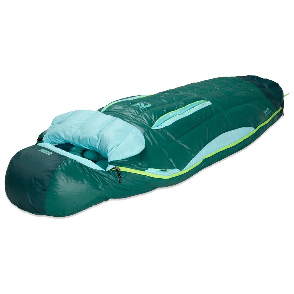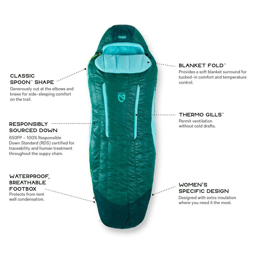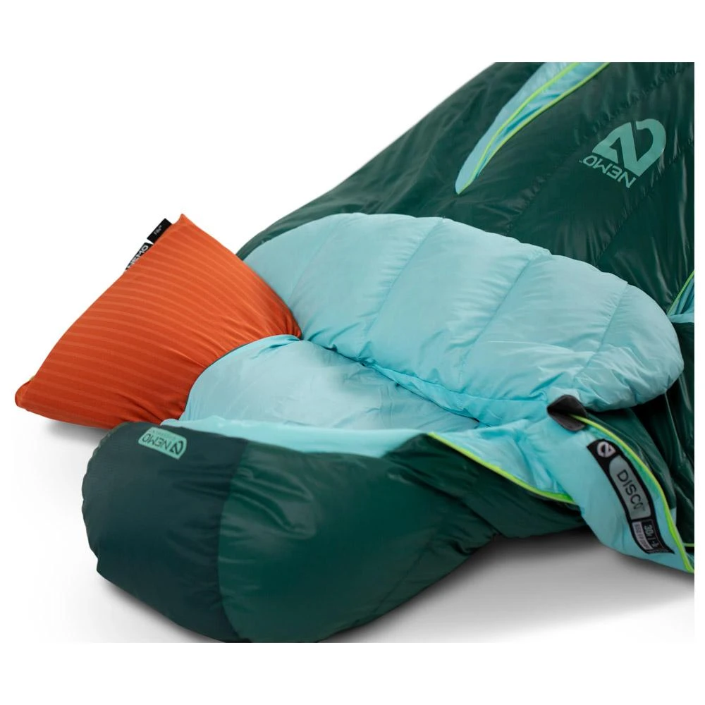 Der Disco Womens 30 von Nemo ist ein umweltfreundlicher Schlafsack mit einer Daunenfüllung, die nach dem Responsible Down Standard zertifiziert ist und über eine wasserabweisende Behandlung ohne Perfluorkohlenstoffe verfügt.