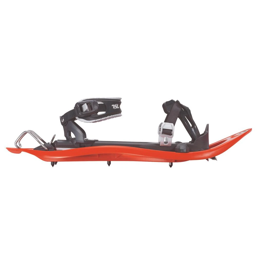 Der TSL 305 Elevation hat 6 austauschbare Stahlzacken sowie eine Frontkralle, die sich an den Hängen bewährt. An der Ferse ist dieser Schneeschuh mit einem Keil ausgestattet, der es ermöglicht, die Bindung anzuheben, um den Neigungswinkel beim Aufstieg auszugleichen. Der Schneeschuh TSL 305 Elevation verfügt außerdem über einen Geräusch- und Stoßdämpfer, sodass ihr in aller Ruhe wandern könnt, ohne dass es bei jedem Schritt klappert.