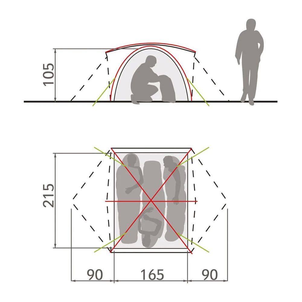 Höhe des Zeltes: 105 cm / Breite: 165 cm / Länge: 215 cm.